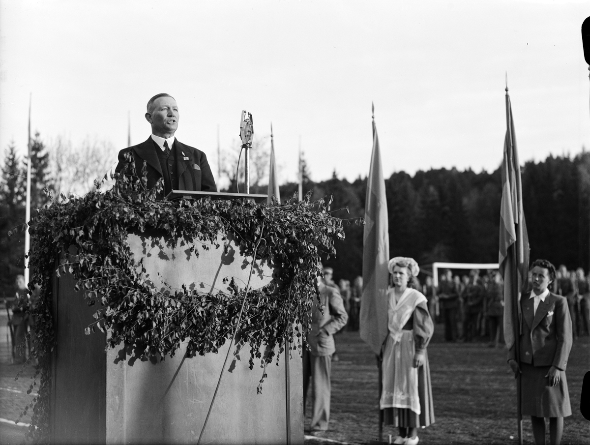 Titel: "Ståtlig flaggfest i Upsala. Väldigt uppbåd på Studenternas idrottsplats", Uppsala 1941