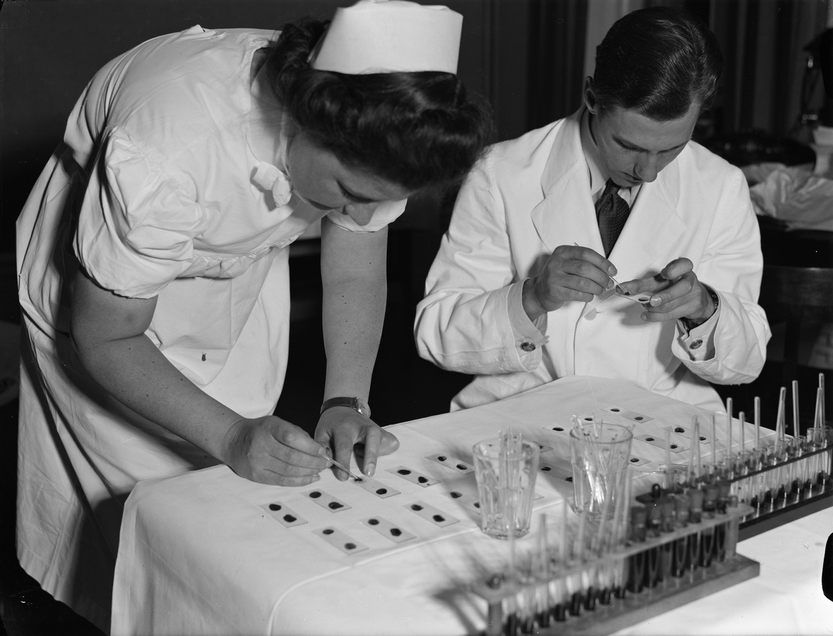 "Personalen på Ulleråker lämnar blod till armén" - sjuksköterskan Karin Bengtsson och läkaren Thore Gustafsson testar blod som personalen på Ulleråkers sjukhus lämnat, Uppsala oktober 1941