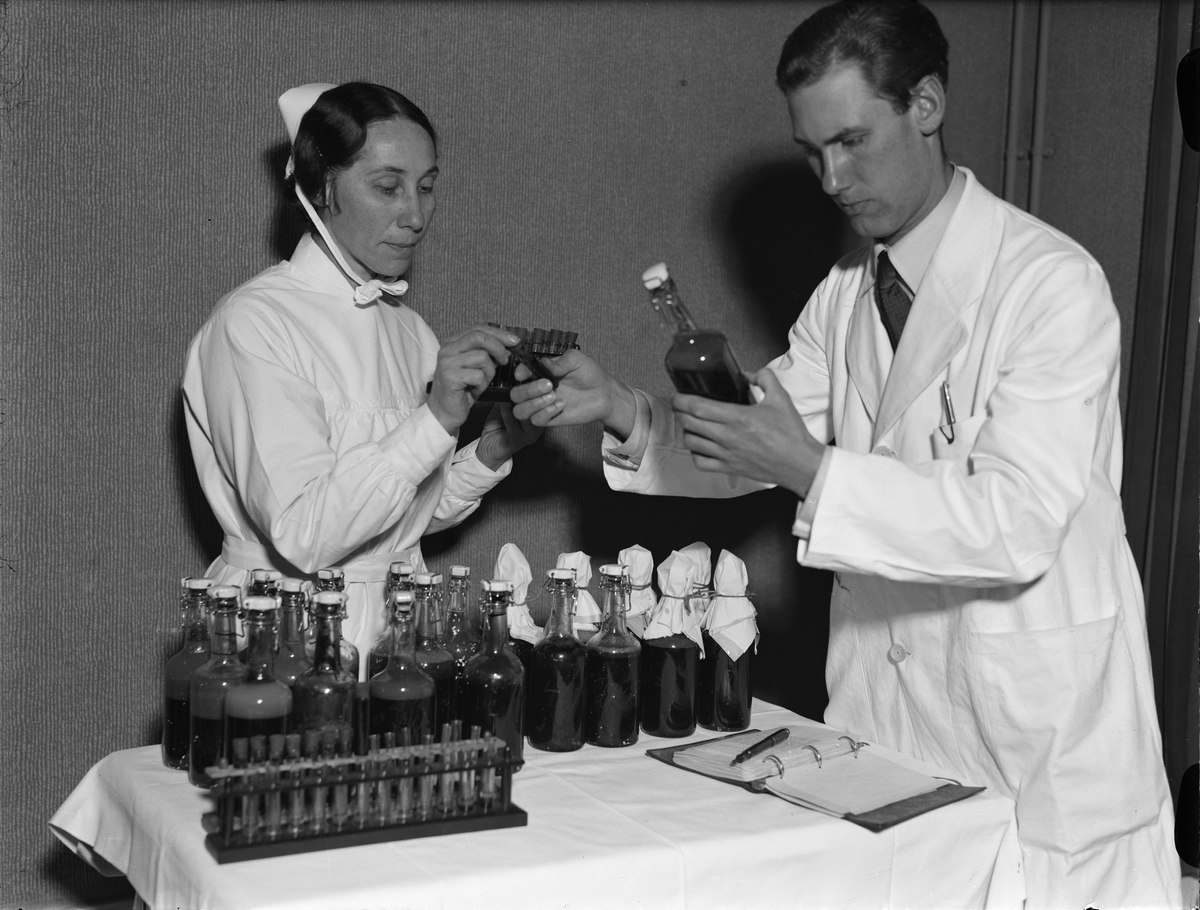 "Personalen på Ulleråker lämnar blod till armén" - sjuksköterskan Maja Öberg och läkaren Thore Gustafsson med blod som personal på Ulleråkers sjukhus lämnat, Uppsala oktober 1941