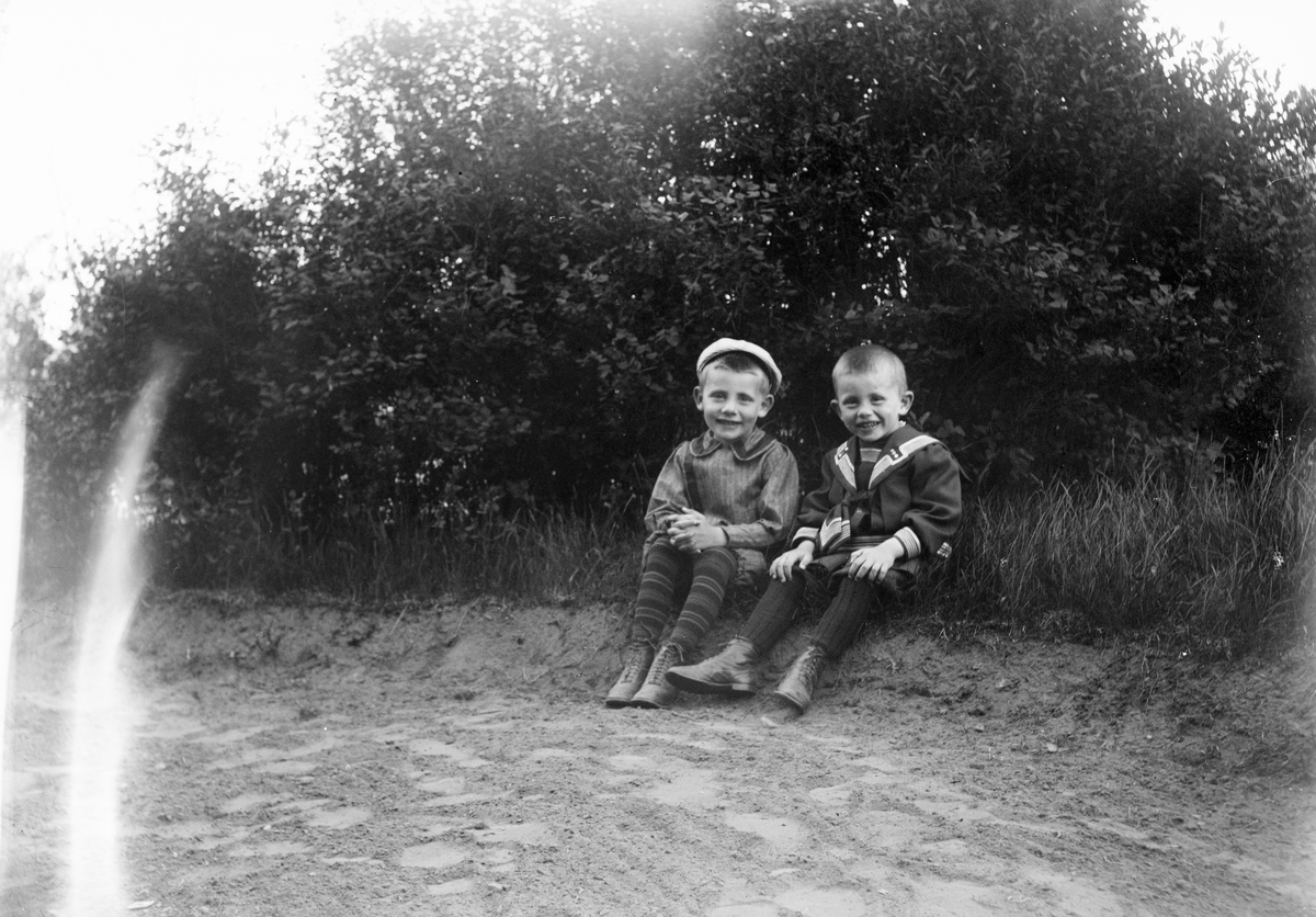 Roland och Alf Liljefors sittande ute på gräset, sannolikt i Sverige