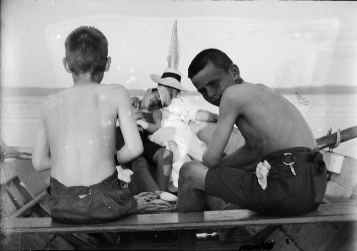 Christiane, Roland, Alf och Ingemar Liljefors ute på sjön med roddbåt, sannolikt i Sverige
