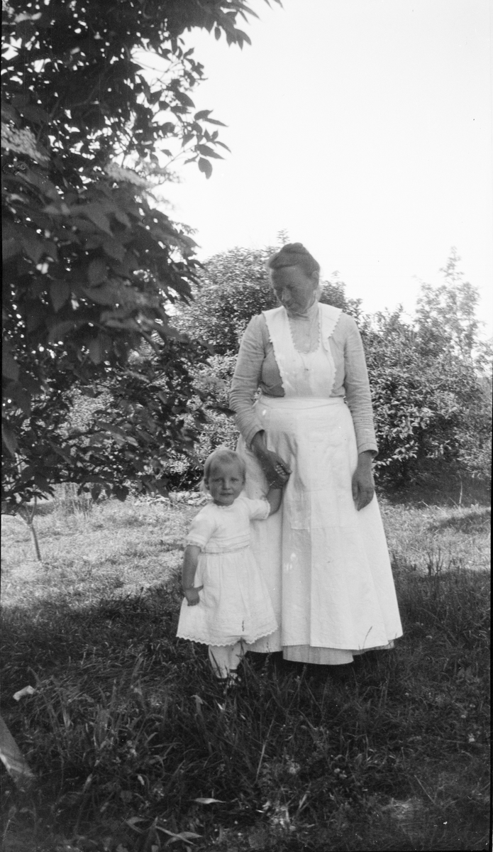 Marit Liljefors med kvinna i trädgård sannolikt hos hennes morföräldrarna i Stavanger i Norge