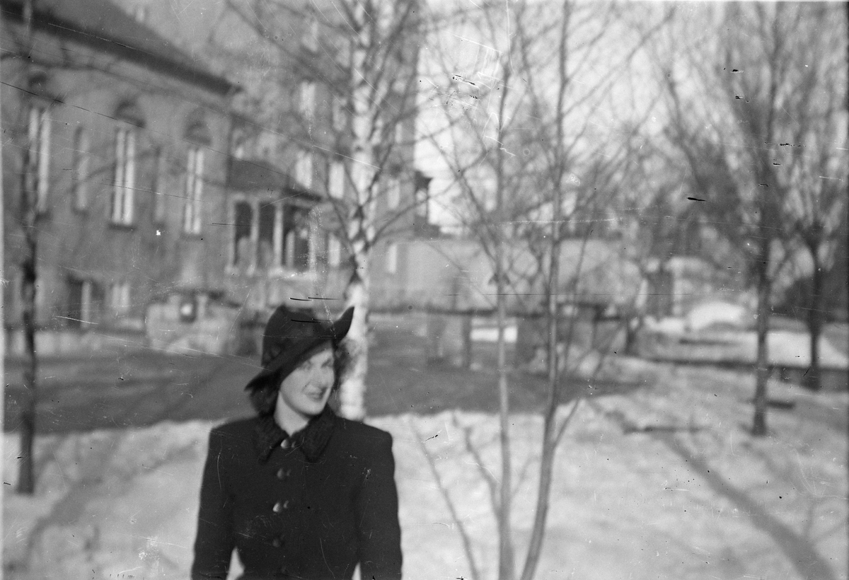 Kvinna framför byggnad, sannolikt i Sverige 1930-40-tal