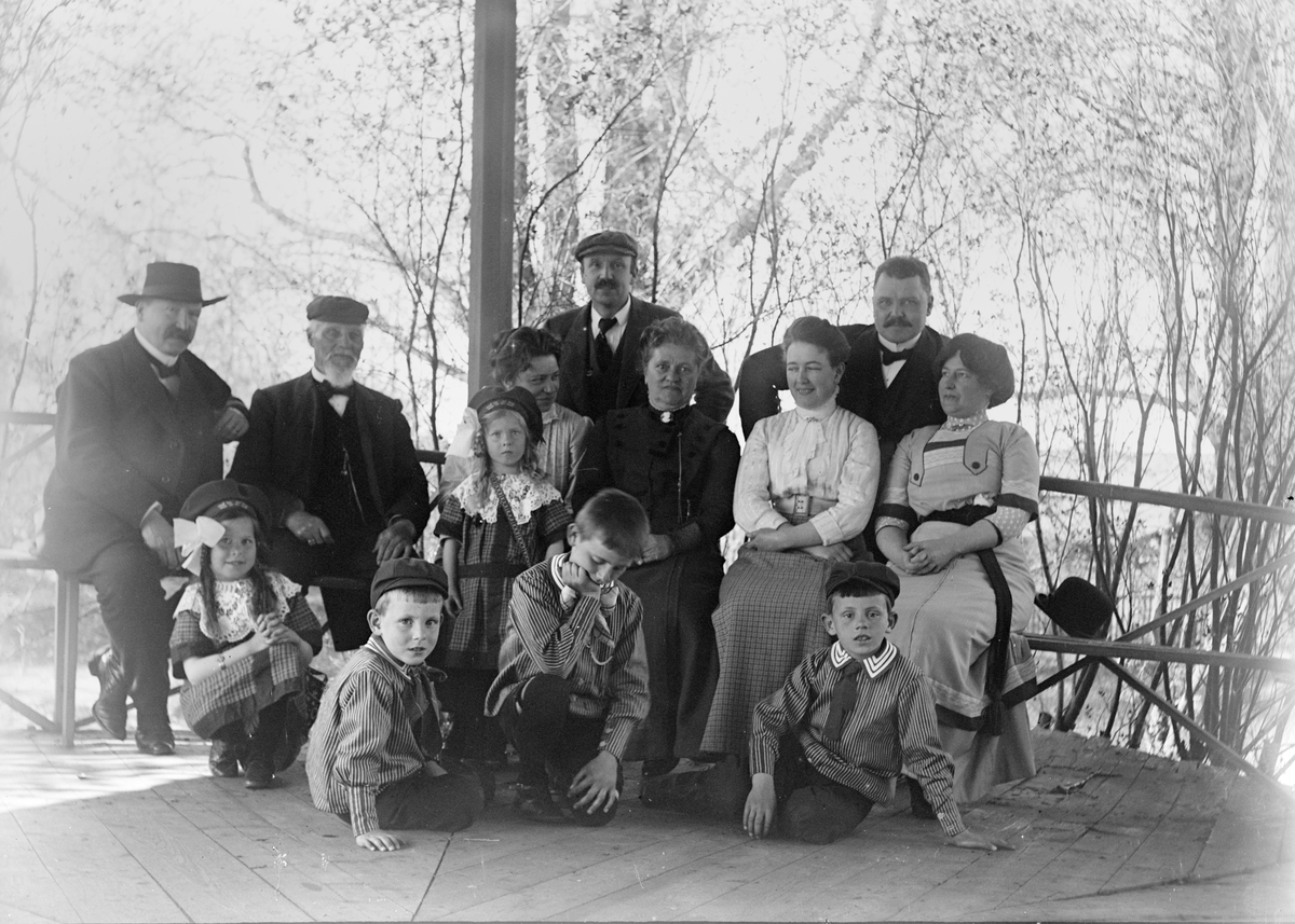 Ruben och Christiane Liljefors med familj och släkt sittande på terassen, sannolikt i Sverige