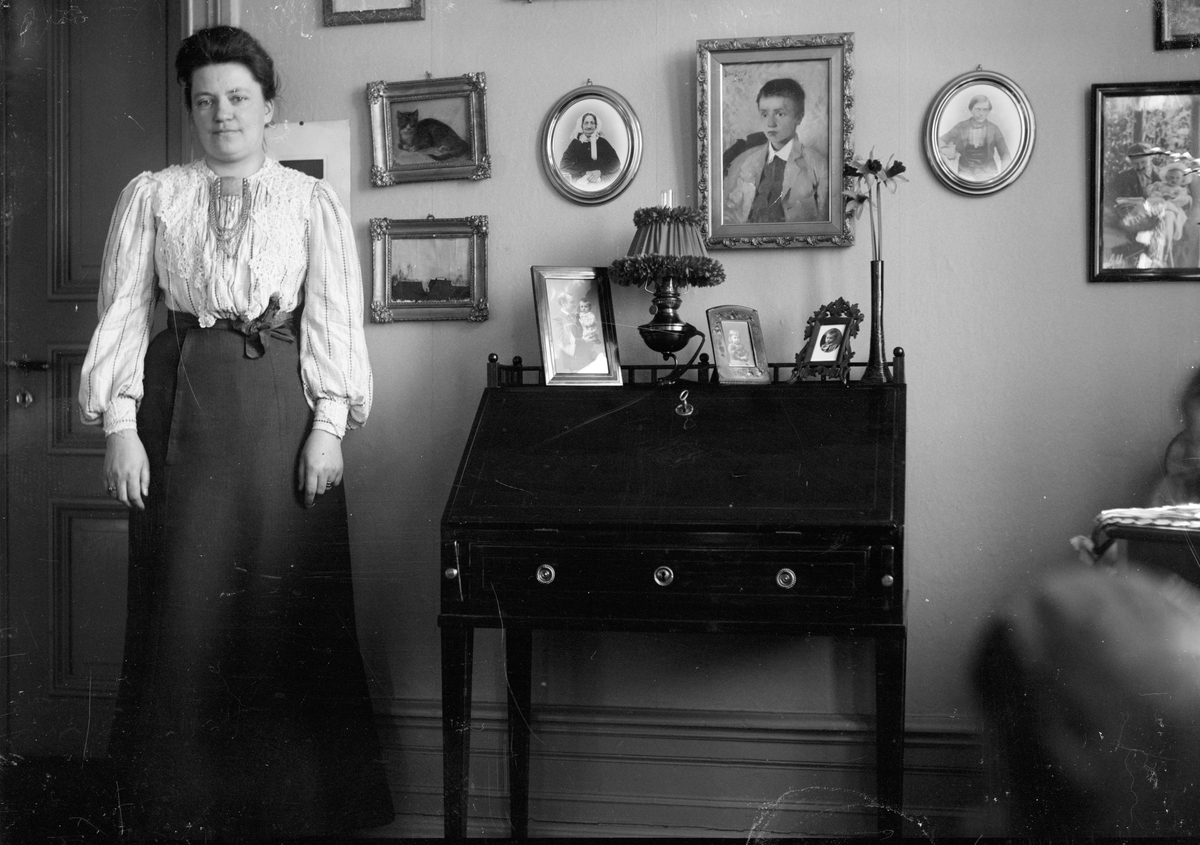 Christiane Liljefors stående vid en liten sekretär i hemmet, sannolikt Gävle
