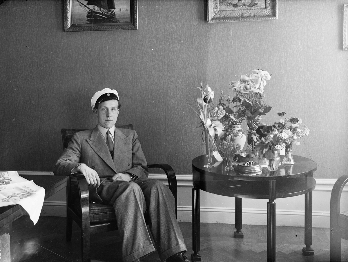 Ung man med studentmössa sitter i fåtölj vid bord med blommor, sannolikt i hemmet, Sverige