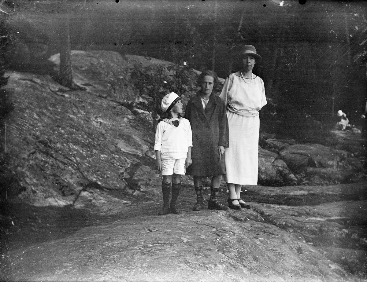 Kvinna, flicka och pojke står på klippa sannolikt i Sverige