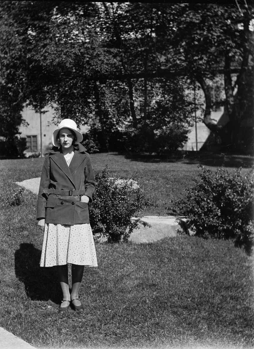 Ung kvinna står på gård, större hus i bakgrunden, sannolikt i Sverige