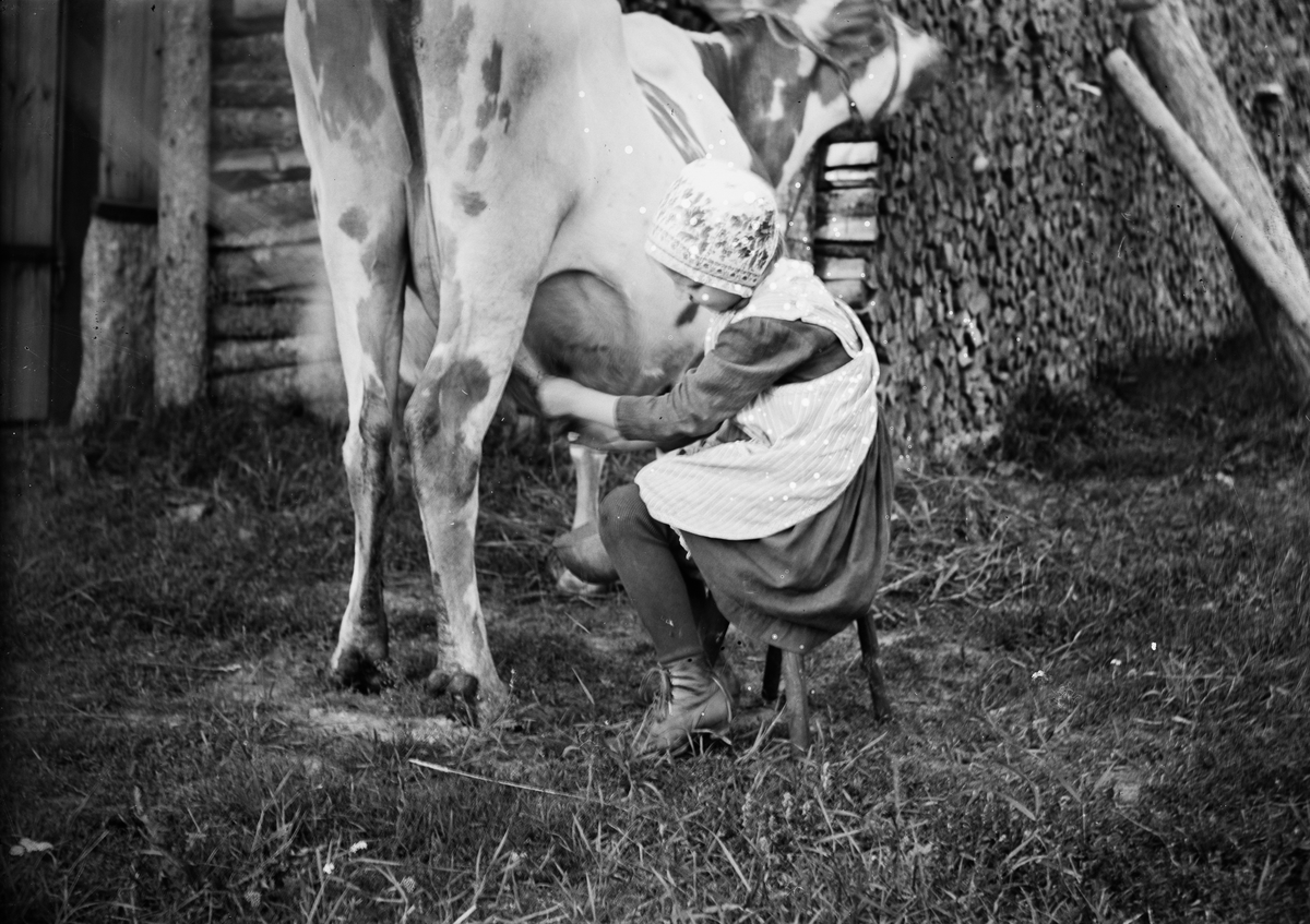 Sannolikt Ruben och Christiane Liljefors dotter Marit mjölkar ko, sannolikt i Dalarna
