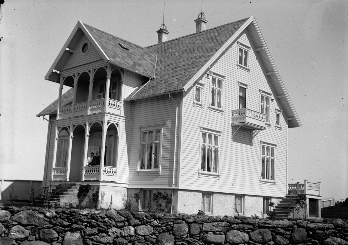 "Grönvold", Christiane Liljefors föräldrahem på Hornklovsgate i Stavanger, man och kvinna står på verandan, Norge