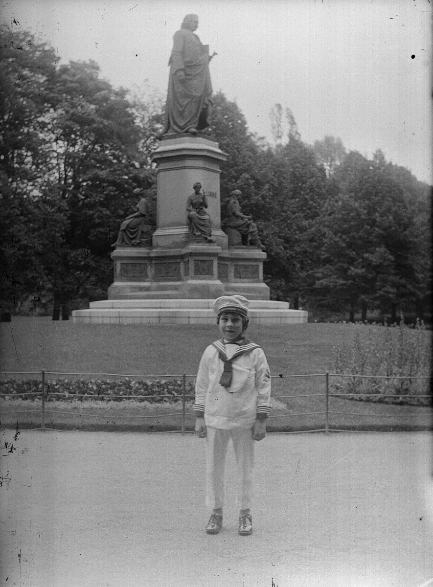 Liten pojke i sjömanskostym framför Linnéstatyn i Humlegården, Stockholm efter 1885