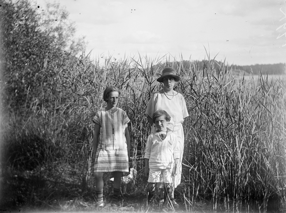 Kvinna, flicka och liten pojke står vid stranden i vass, sannolikt i Sverige