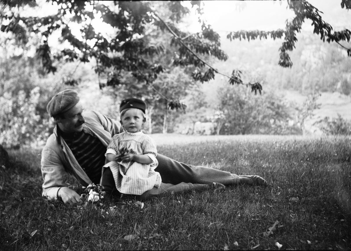 Ruben Liljefors med sannolikt sin son Roland i trädgård under trädet, sannolikt Sverige