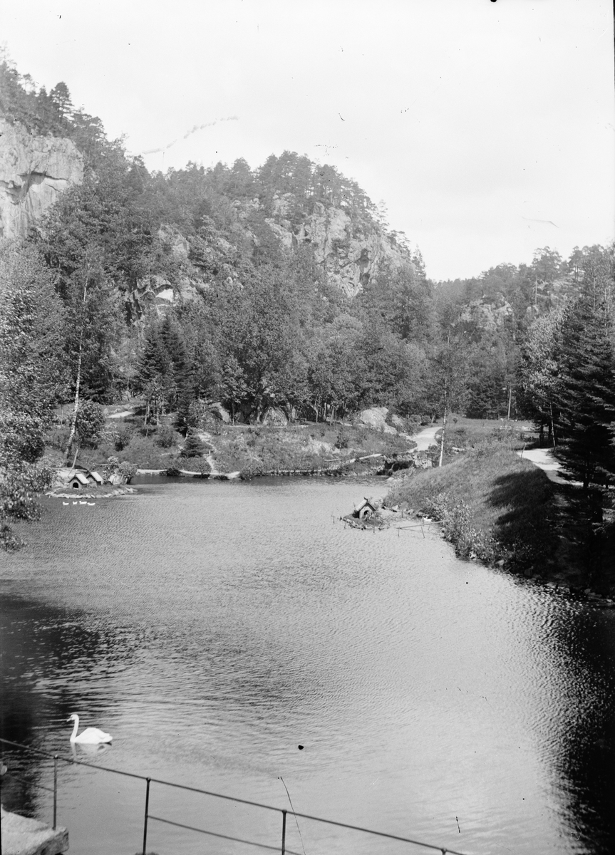 Park med vattendrag nedanför berghäll, i vattnet små öar med hus till fåglar, sannolikt i Stavanger, Norge