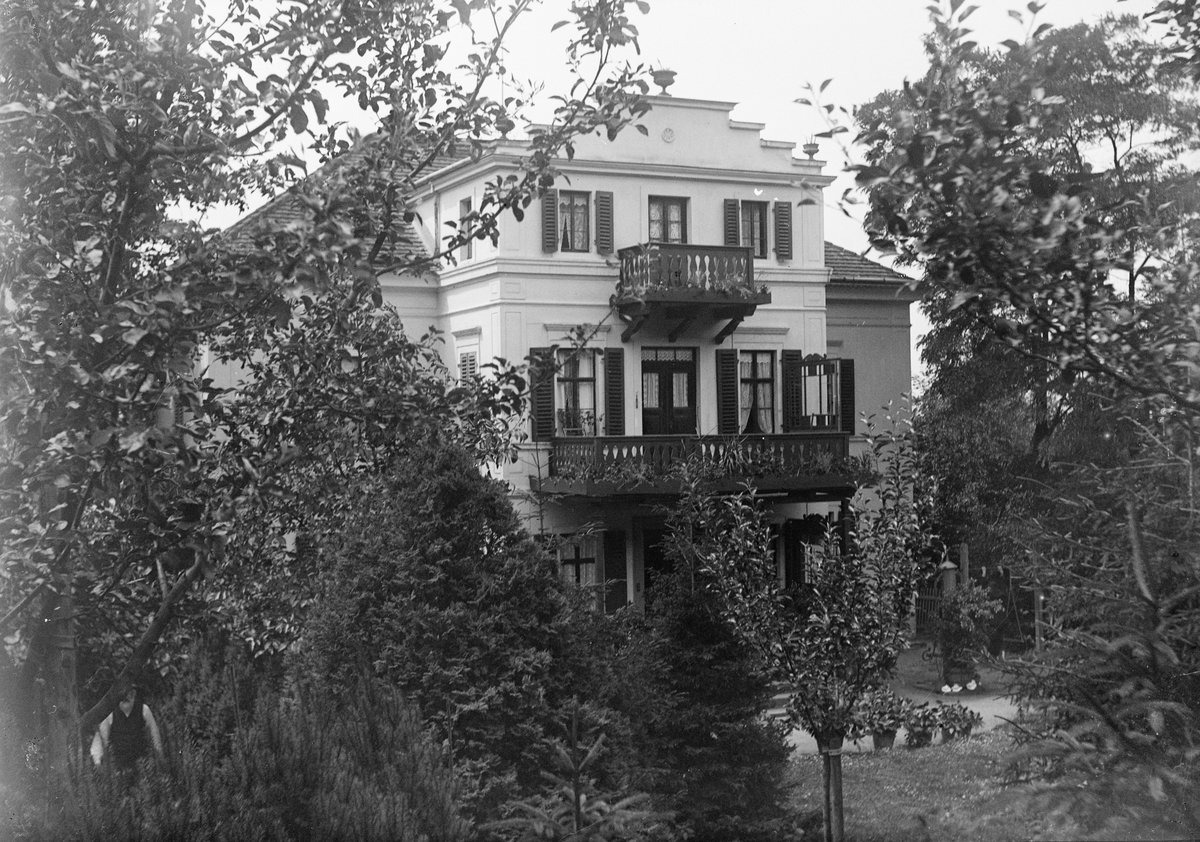 Bostadshus i lummig trädgård, man skymd bakom träd, sannolikt i Sverige