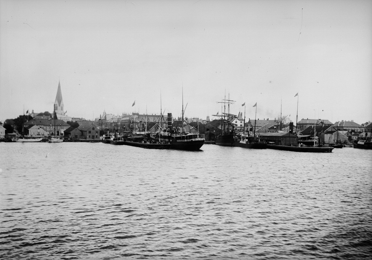 Hamn med flera fartyg, sannolikt Stavanger, Norge