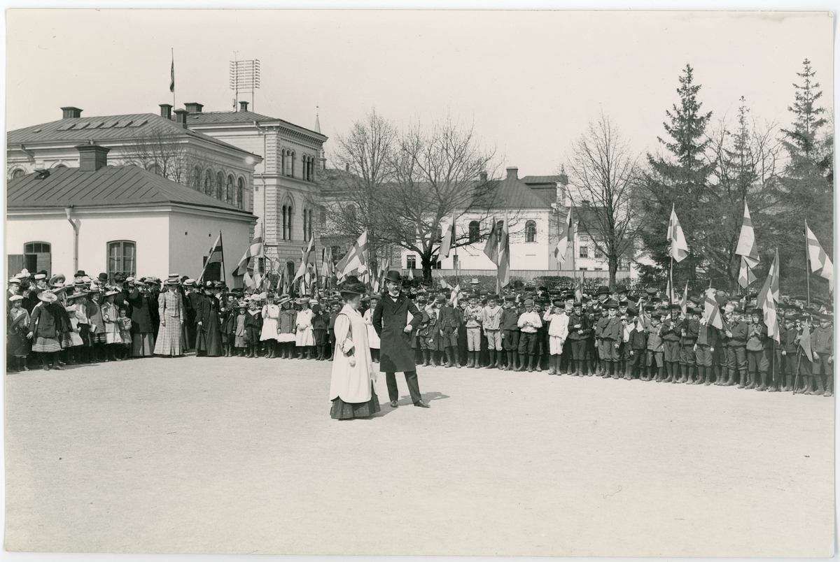 Selma Lagerlöf uppvaktas av folkskolebarnen vid Linnéjubileet, Uppsala 1907