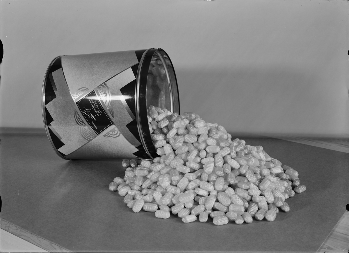 Karameller och karamellburk från AB Karamell- & Chokladfabriken Sonja, Svartbäcksgatan 26, Uppsala 1938