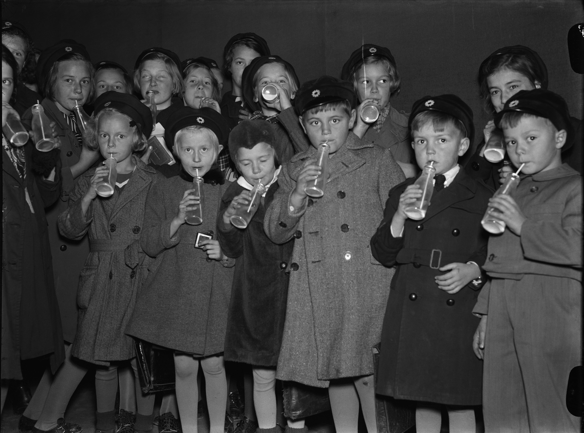 Titel: "Mjölkdrickning genom kobbelrör är slagnummer. Uppskattad skolpropaganda under mjölkveckan", Uppsala 1938