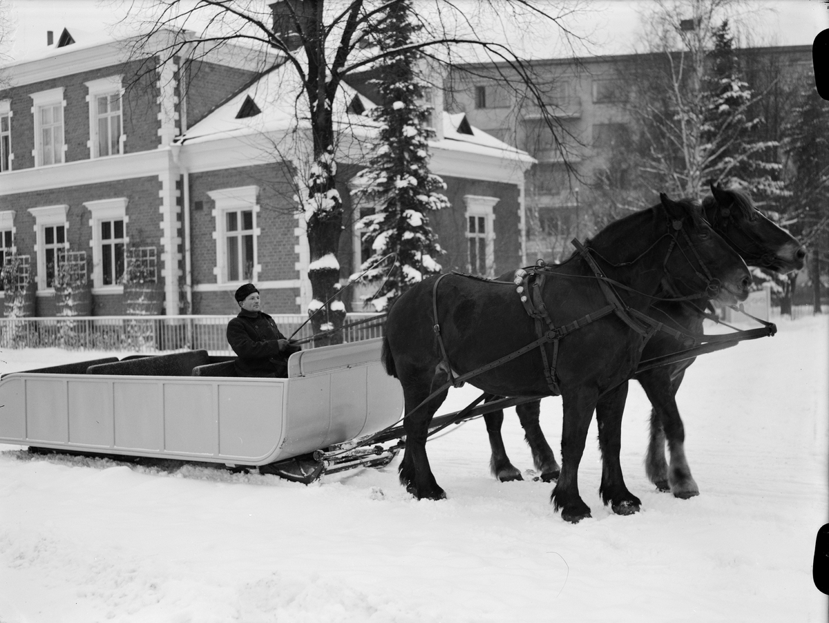 Ekipage med hästar och släde utanför Villa Isola, kvarteret Valhall, Uppsala 1939