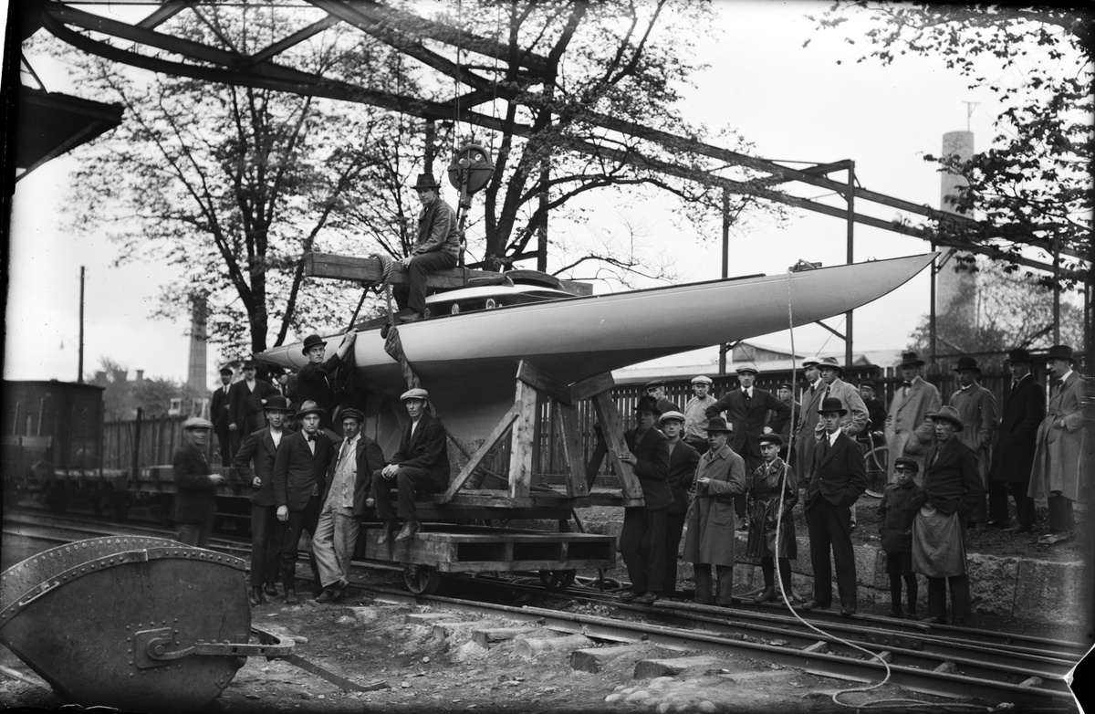 Medlemmar i Ekolns Segelklubb vid deras första lottbåt, sjösatt i Fyrisån, Uppsala 15 juni 1923
