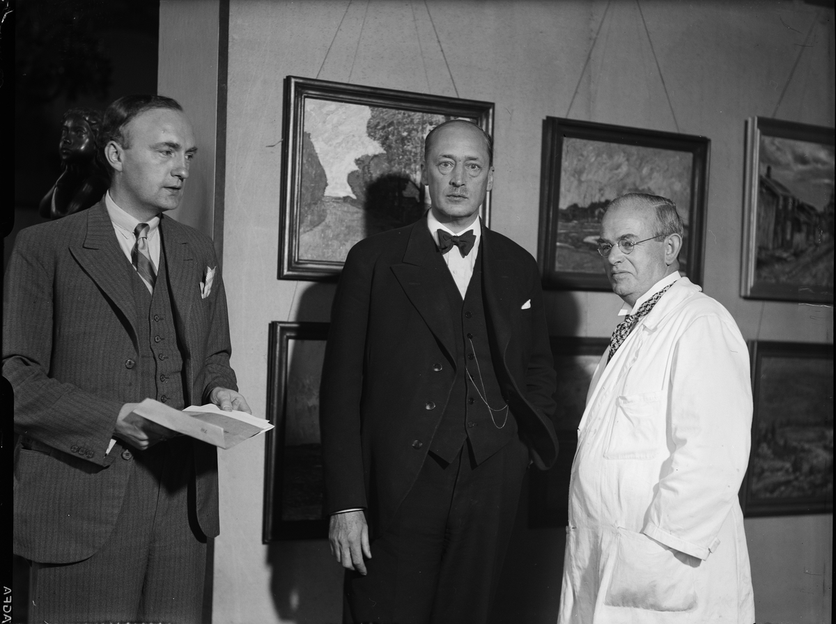 "Förnämlig utställning av uplandskonst" - intendent Nils Ålenius, landssekreterare Elias Stenius och utställningskommissarie Bernhard Berg, Upplands konstförenings utställning, Uppsala september 1936