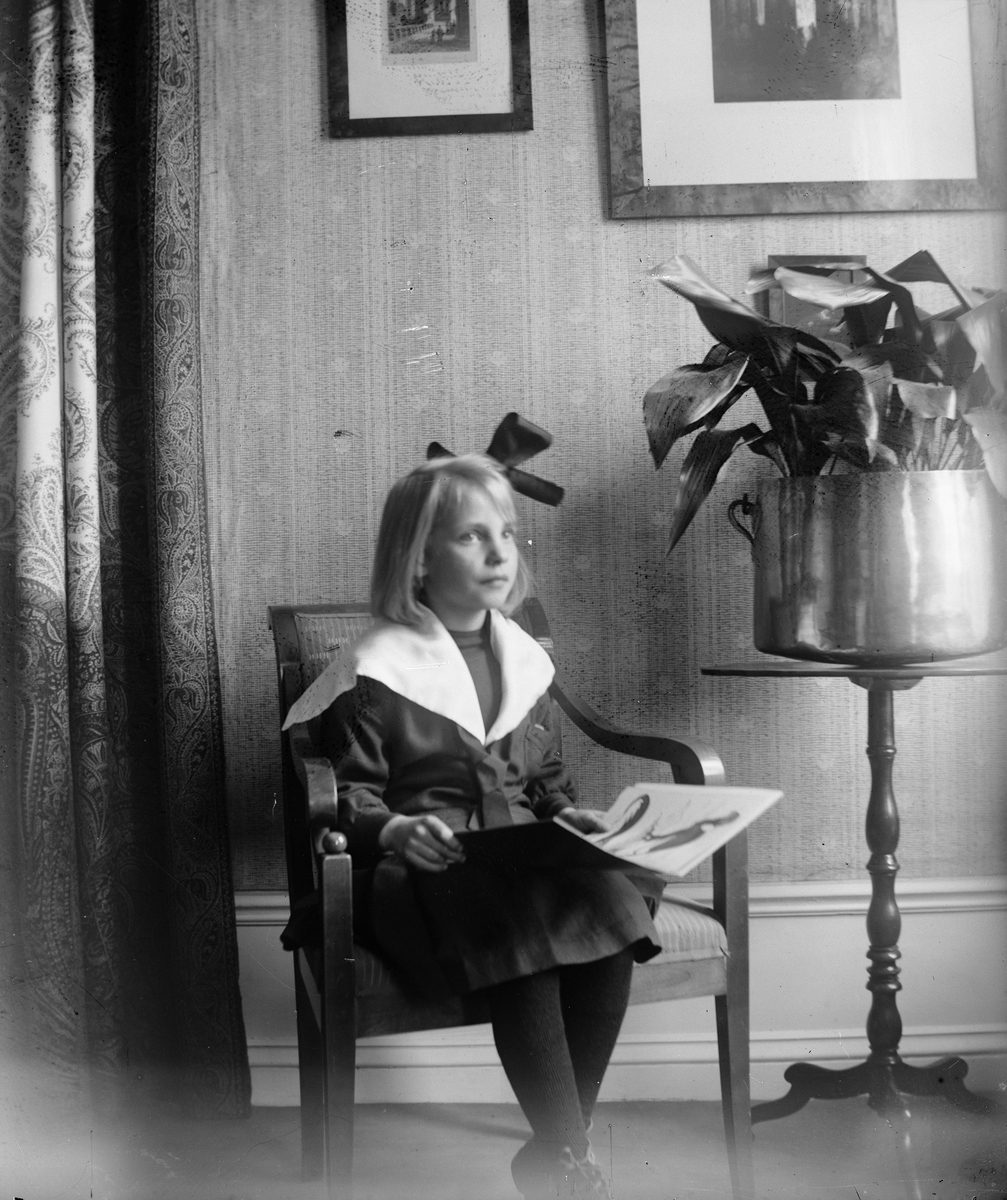 Ruben Liljefors dotter Marit sitter på stol och läser bok i hemmet, sannolikt i Sverige