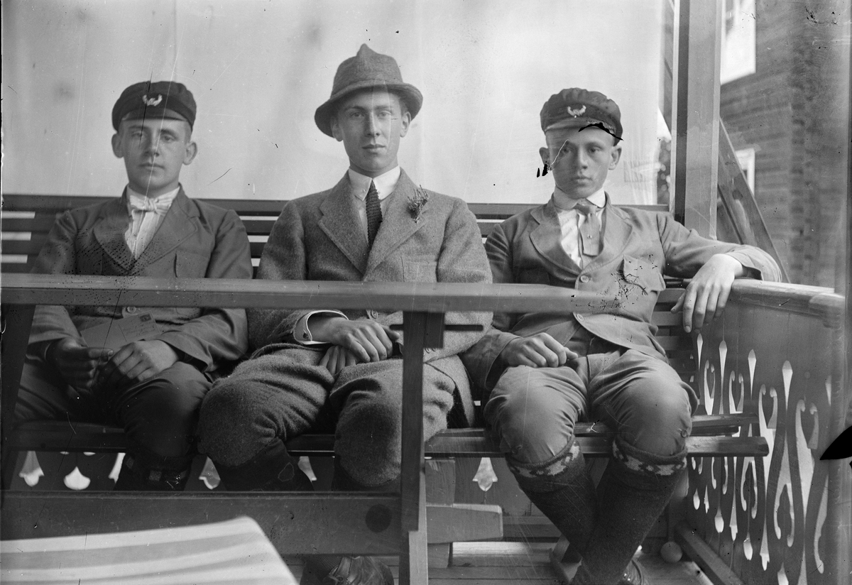 Tre ungdomar, två av sönerna Liljefors, sannolikt Alf och Roland, sitter på en bänk, sannolikt på veranda till bostadshus i Sverige