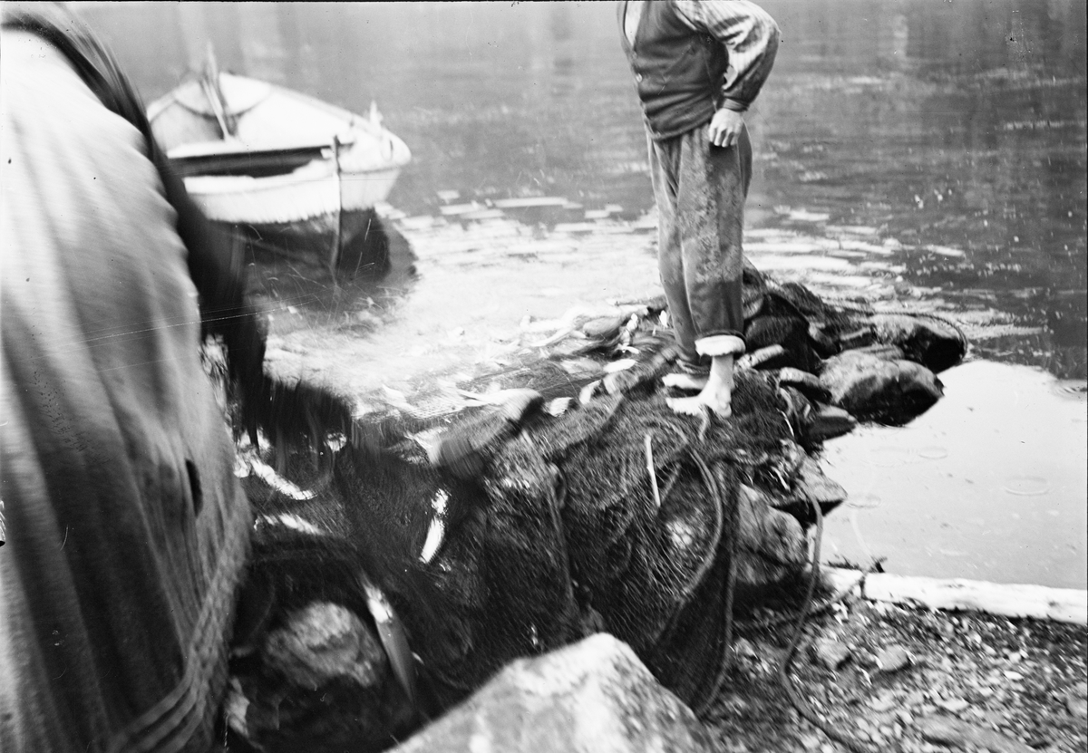 Fiskare med fisknät och båt vid stranden, sannolikt i Sverige