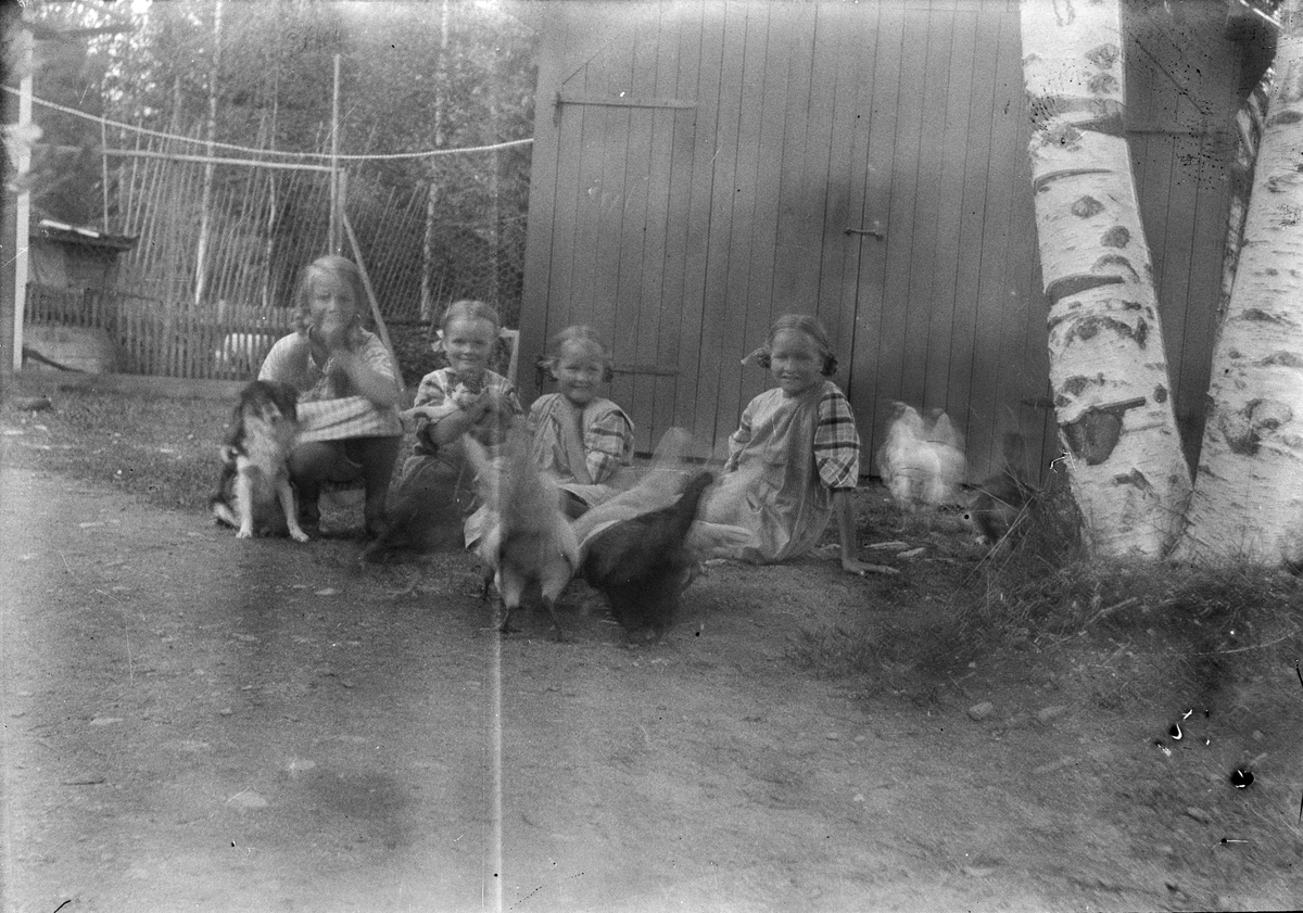 Fyra små flickor med hund tittar på höns ute på gården, sannolikt i Sverige