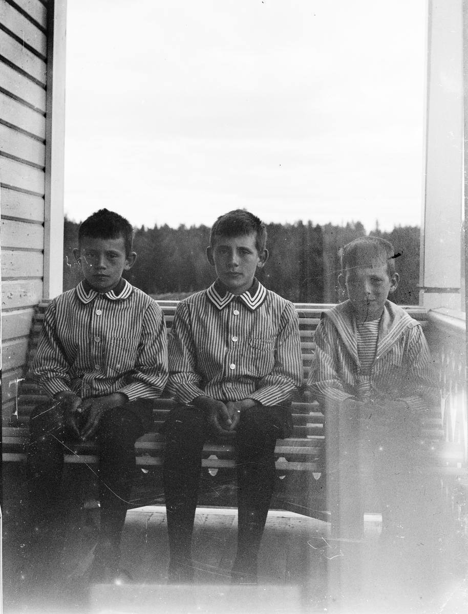 Alf, Roland och Ingemar Liljefors sitter på bänken på veranda, sannolikt i Sverige