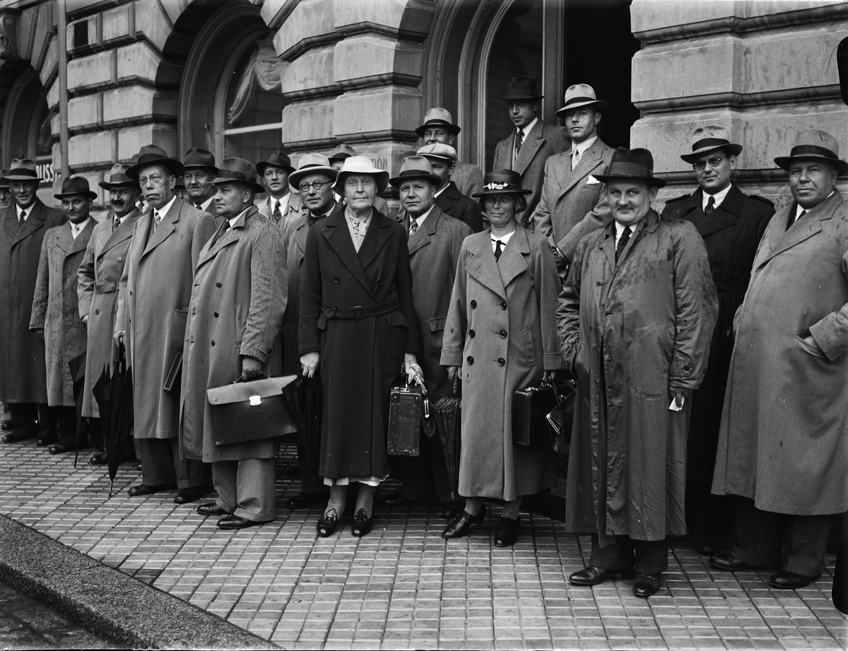 Grupporträtt - kvinnor och män utanför polisstationen i Uppsala stads rådhus, Vaksalagatan, Uppsala 1938