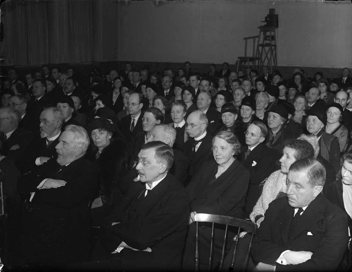 Titel: "Vacker femtioårsfest" - Uppsala arbetarinstitut firar 50-årsjubileum, åhörare i samlingssalen, KFUM-borgen, Uppsala 1933