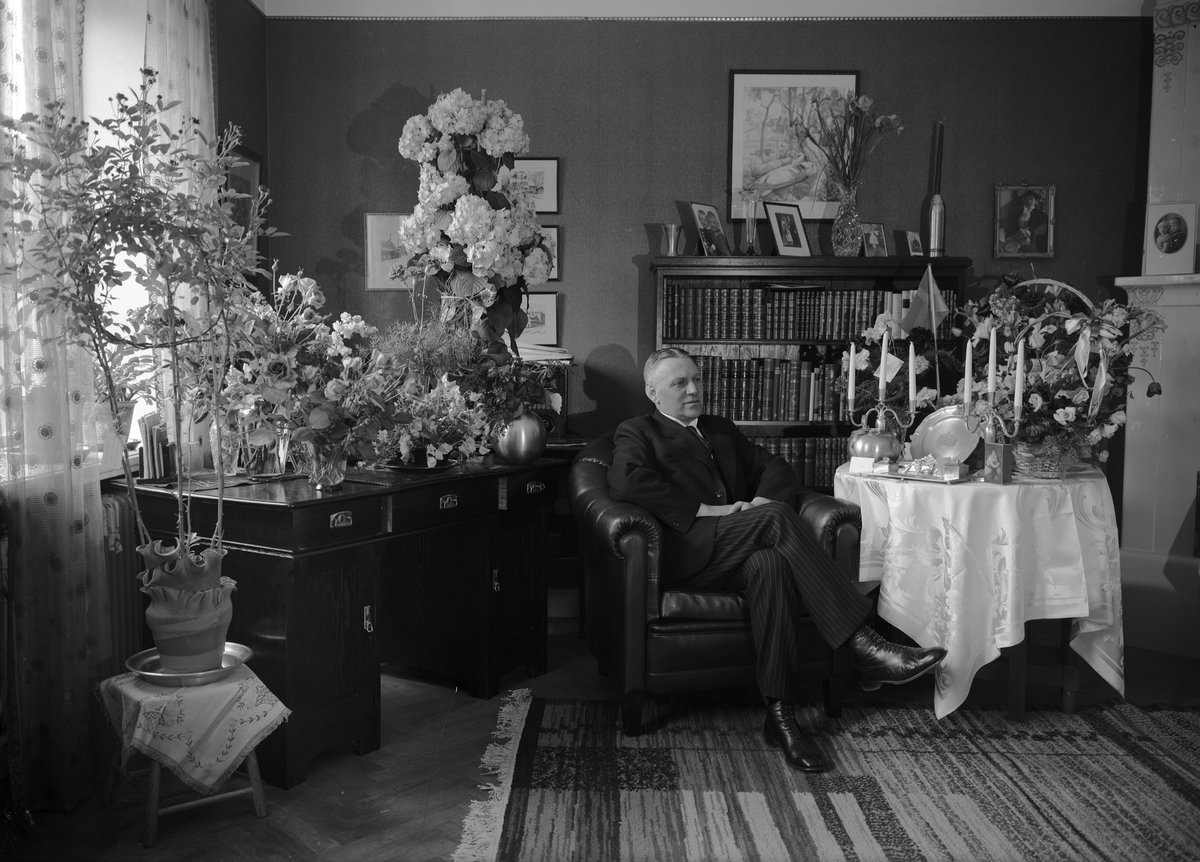 Födelsedagsporträtt - poliskommissarie Herman Bengtsson i hemmiljö, Uppsala 1935