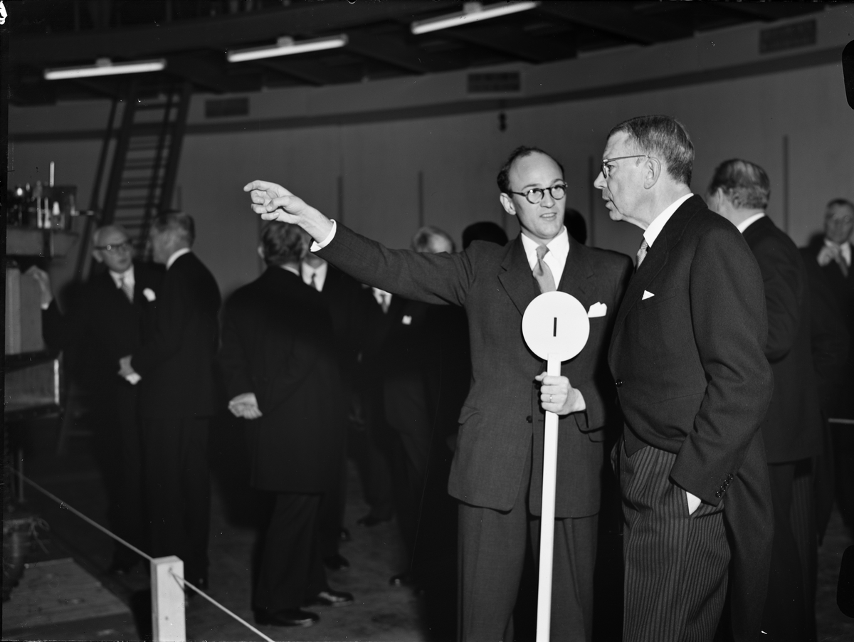 "Cyklotronen mäktigt vetenskapligt instrument", från invigningen av Gustaf Werners institut för kärnkemi, Kåbo, Uppsala december 1949. Kronprins Gustav Adolf i samtal