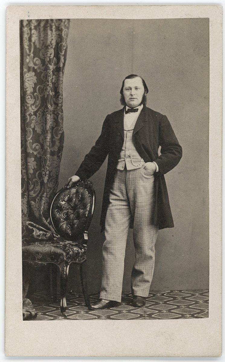 Kabinettsfotografi - en man står vid en stol med ena handen i byxfickan, Uppsala