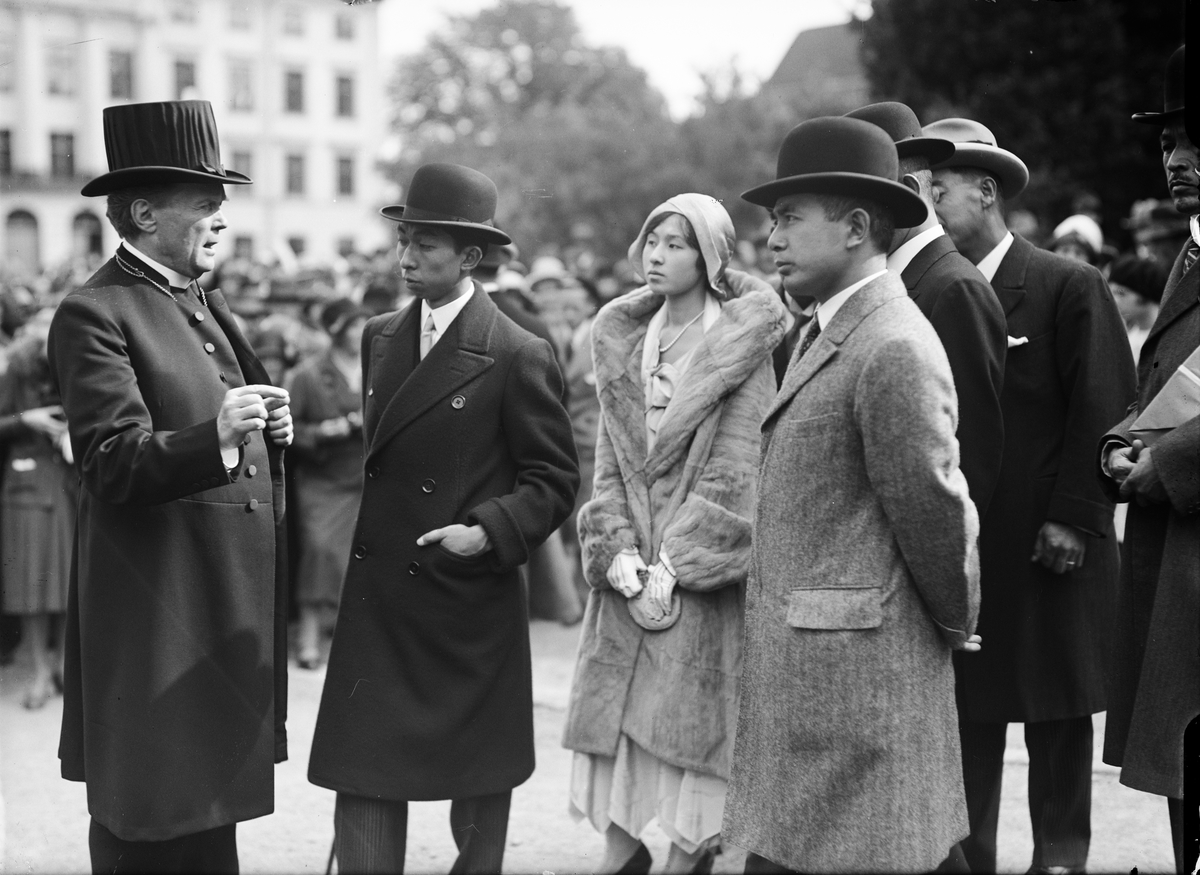 Ärkebiskop Nathan Söderblom "demonsterar en runsten" för det japanska prinsparet Takamatsu med följe, Uppsala augusti 1930