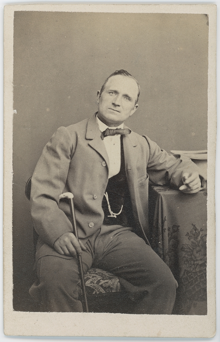 Titel: Kabinettsfotografi - man sitter med en käpp i handen