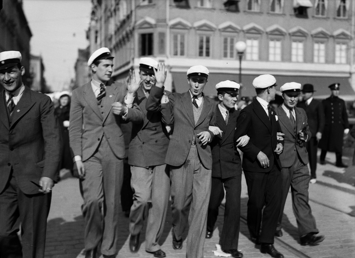 "Studenternas hyllning till våren" - studenter firar "sista april", Drottninggatan, Uppsala 1934