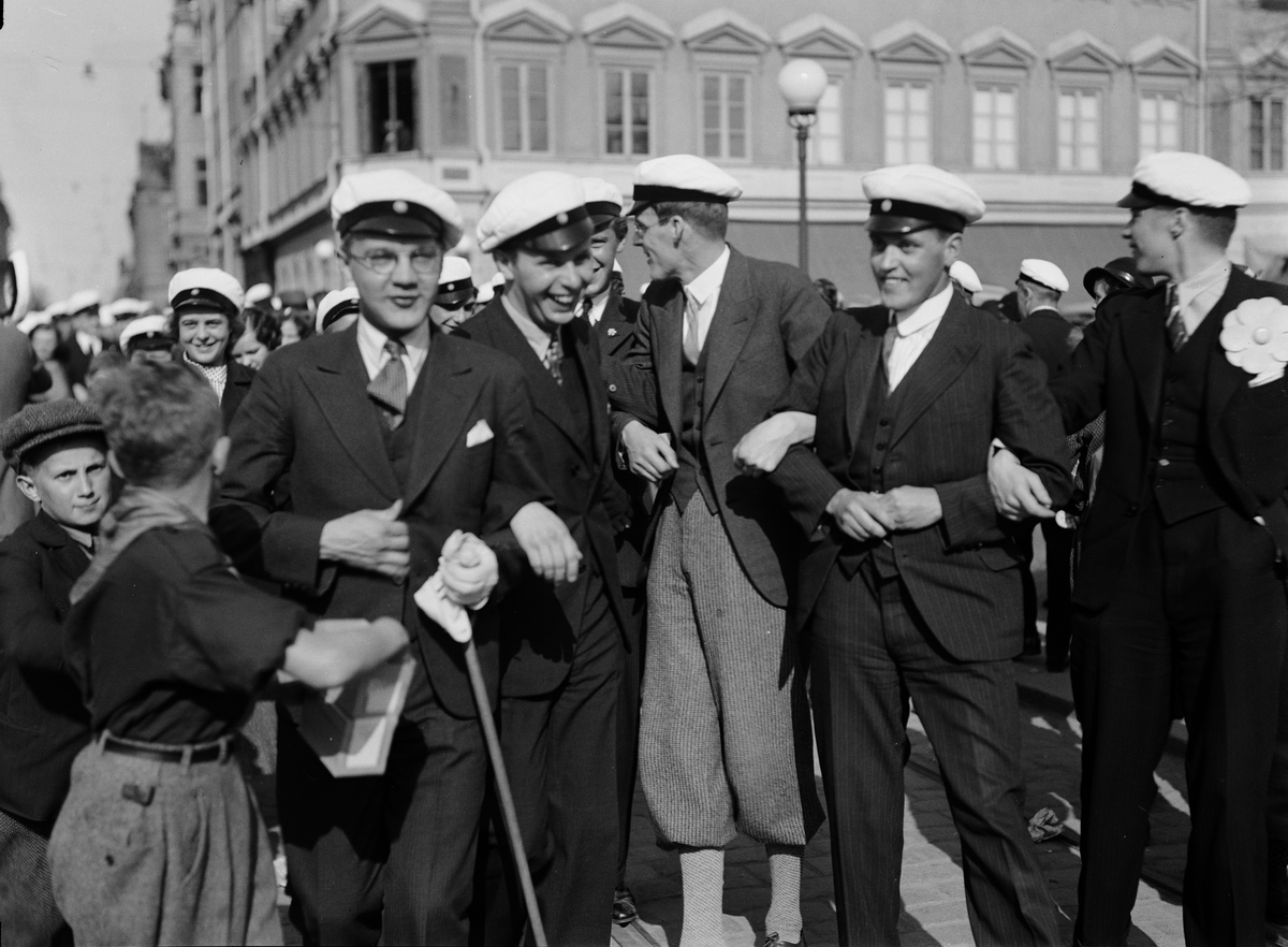 "Studenternas hyllning till våren" - studenter firar "sista april" på Drottninggatan, Uppsala 1934