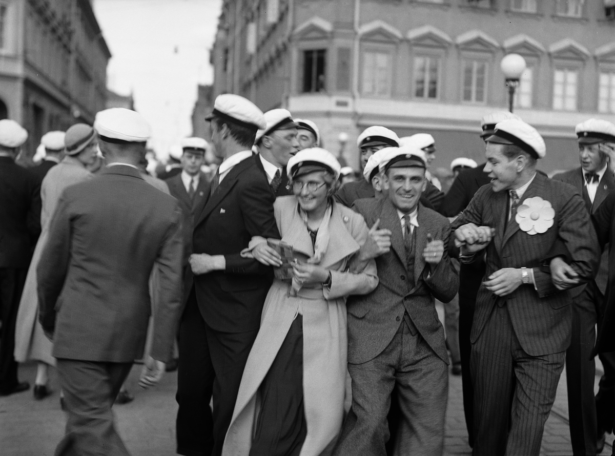 "Studenternas hyllning till våren" - studenter firar "sista april" på Drottninggatan, Uppsala 1934