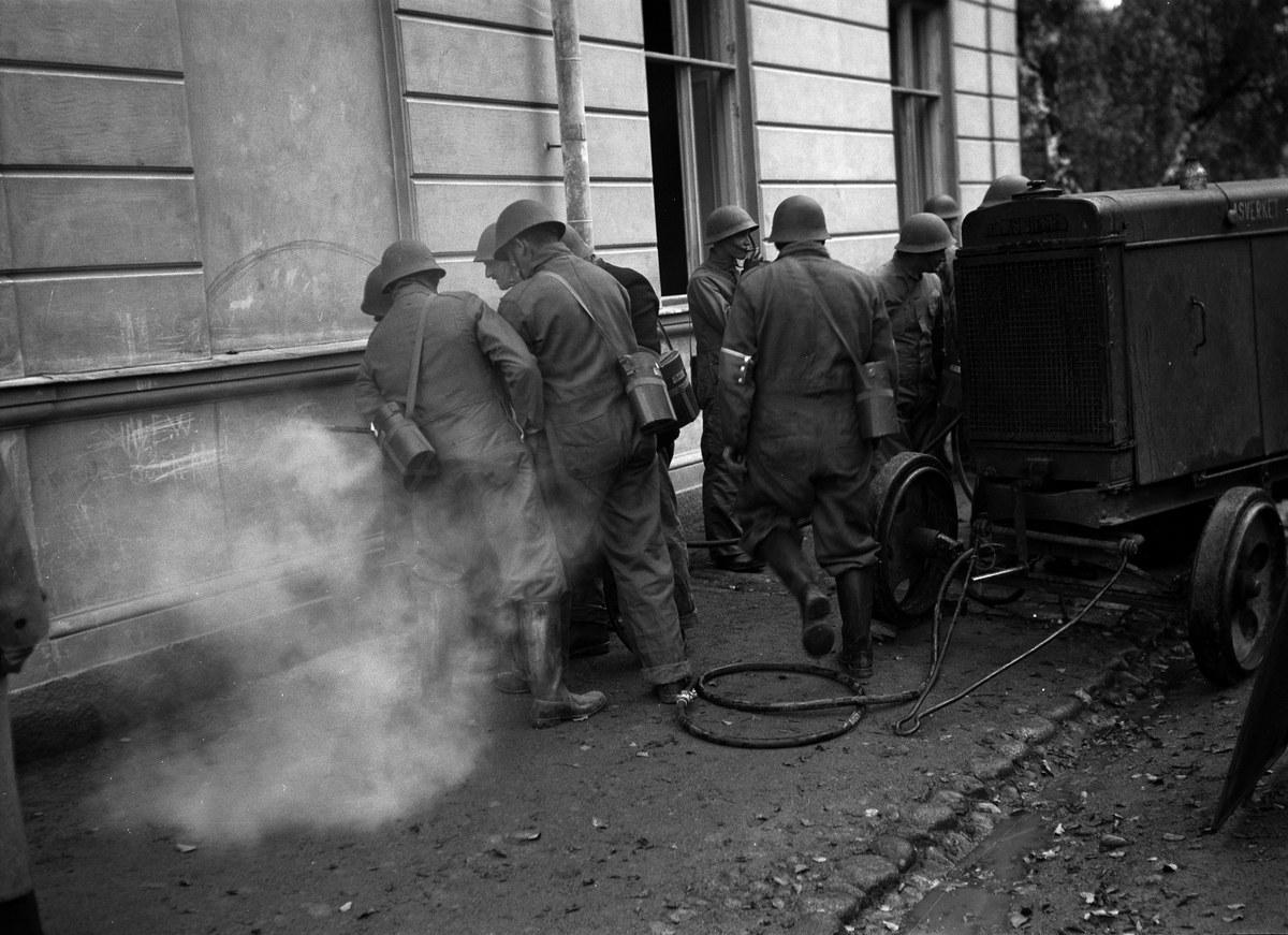 "Överraskningsmoment satte beredskapsavdelningarna på hårda prov" - "en omfattande 'fabriksbrand' hade ordnats i fastigheten Sturegatan 16" under beredskapsövning, Uppsala 1941
