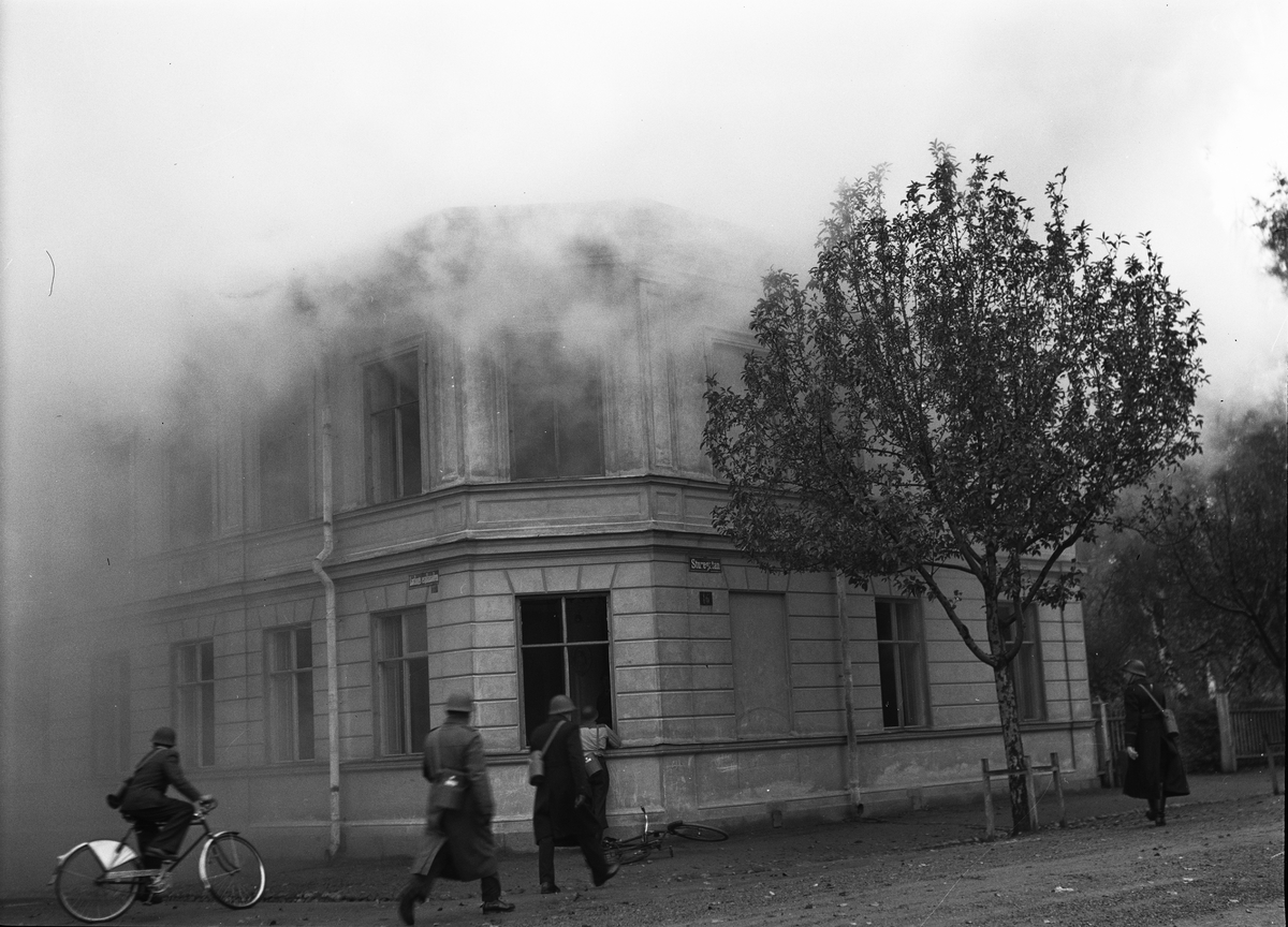 "Överraskningsmoment satte beredskapsavdelningarna på hårda prov" - "en omfattande 'fabriksbrand' hade ordnats i fastigheten Sturegatan 16" under beredskapsövning, Uppsala 1941