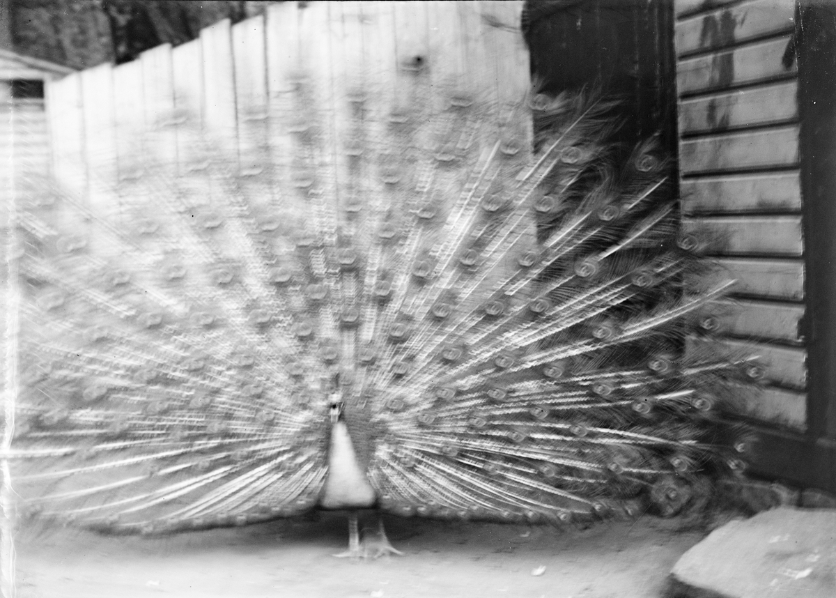 Påfågel visar sina stjärtfjädrar, sannolikt i Sverige