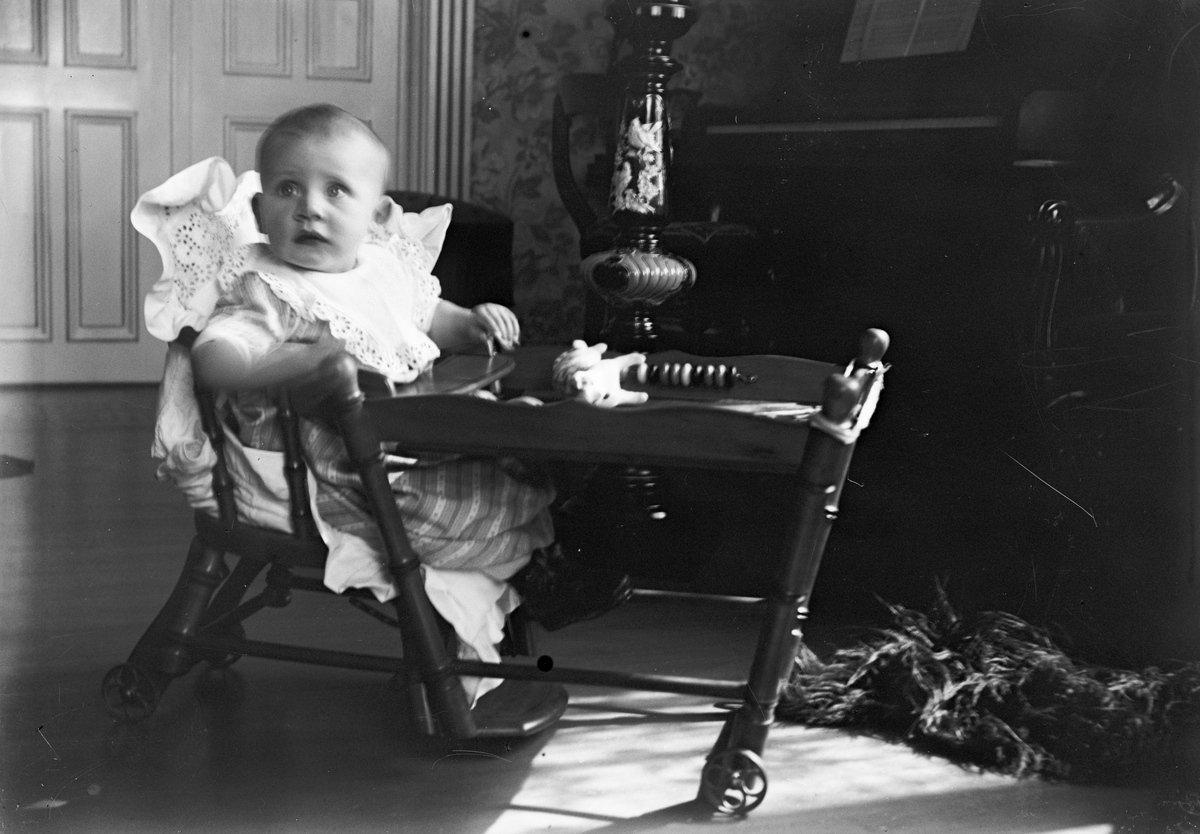 Roland Liljefors sitter i barnstol i hemmet, sannolikt i Sverige