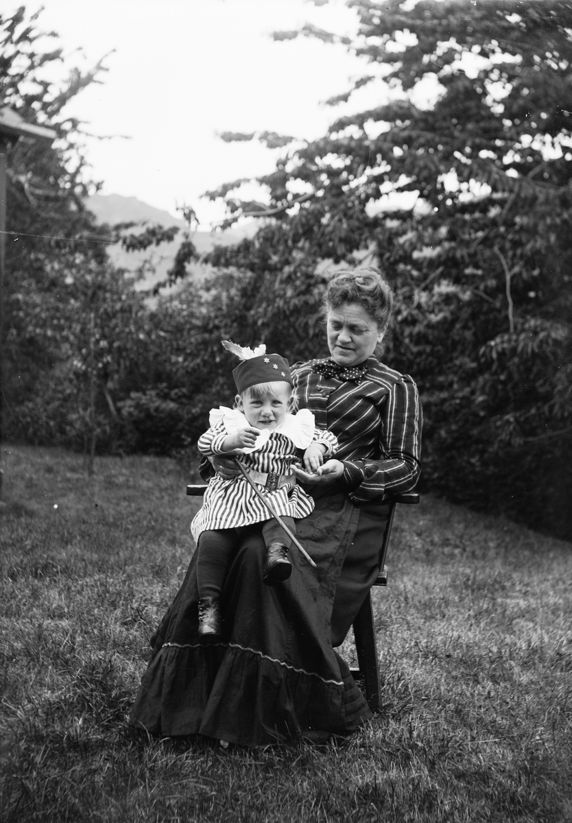 Christiane Liljefors mor Pauline Egelind Pedersen, sannolikt med sitt barnbarn Roland Liljefors, sitter ute i trädgård, i Norge omkring 1903-1904