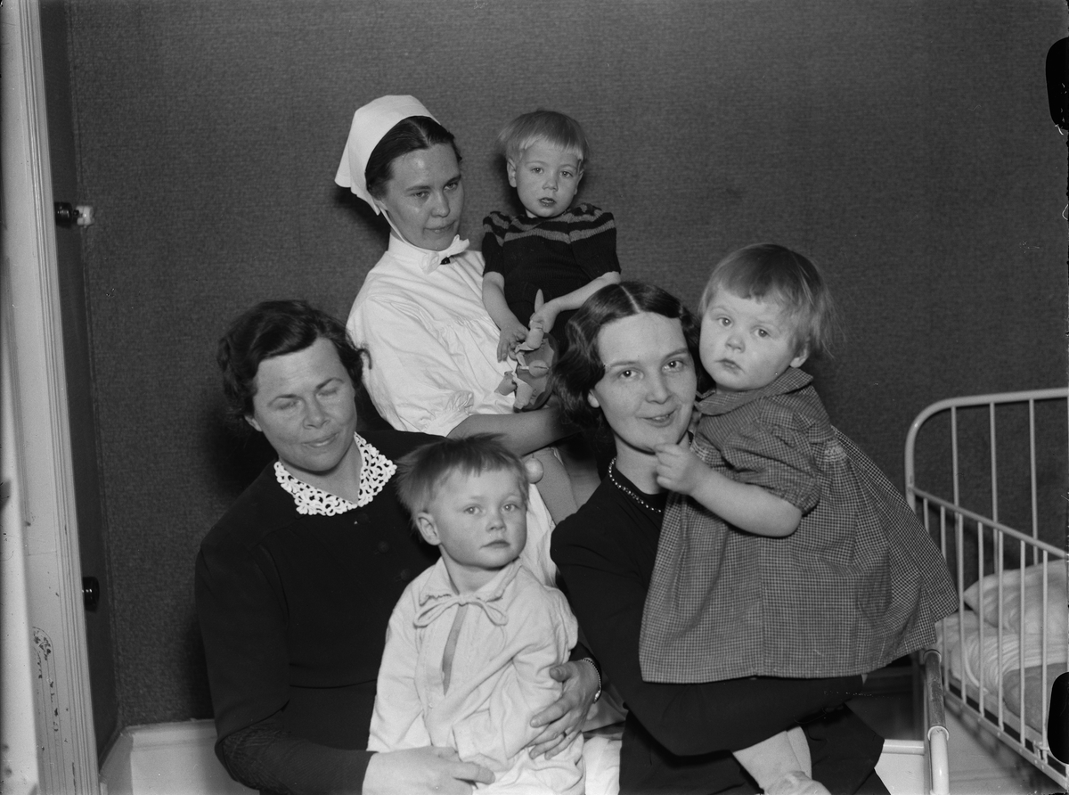 "Fruarna Nyrén och Anderberg samt syster Saima Eriksson med Maila, Anja och Aimo" på Uppsala domkyrkoförsamlings barnhem för finska flyktingbarn, Uppsala mars 1942