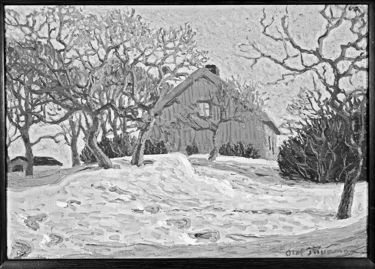 Konstverk - oljemålning med vintermotiv från Ängerås gård, Varnhem, signerad av konstnären Olof Thunman, fotograferad 1942