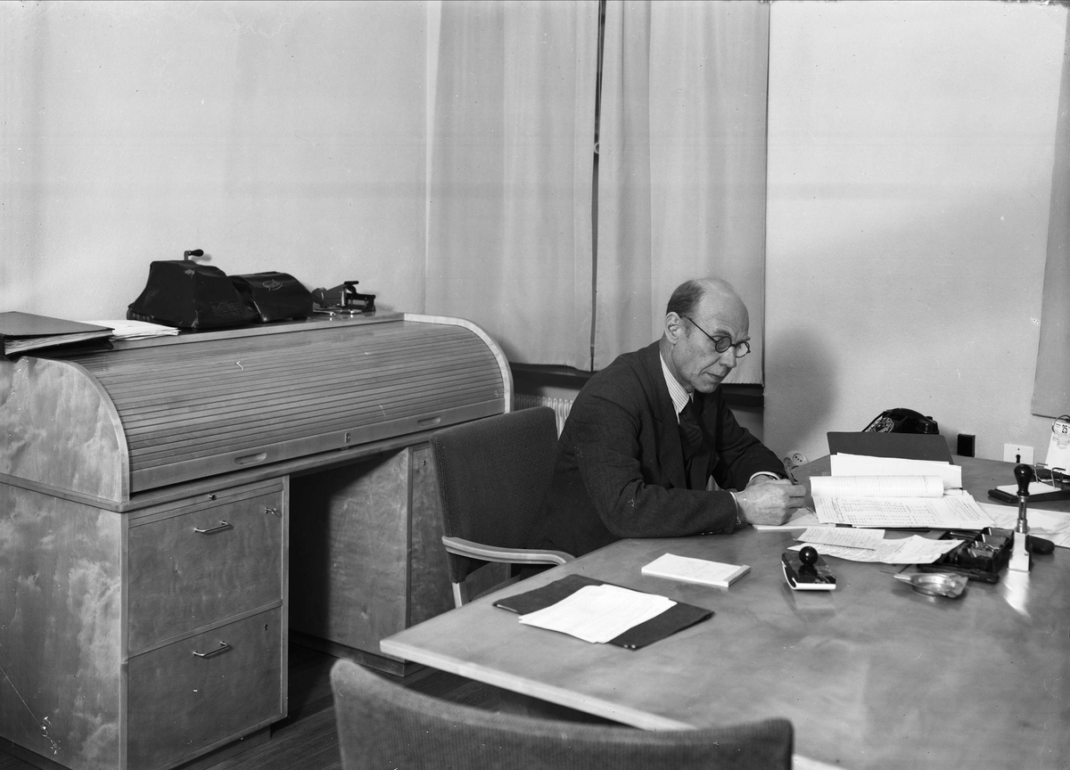 "Nya administrationsbyggnaden för gas- och elverken", ingenjör Oscar Rising i sitt nya chefskontor, Uppsala 1942