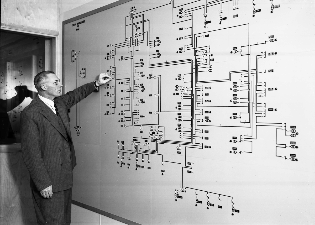 "Nya administrationsbyggnaden för gas- och elverken", ingenjör O Mannberg vid signaltavlan, Uppsala 1942